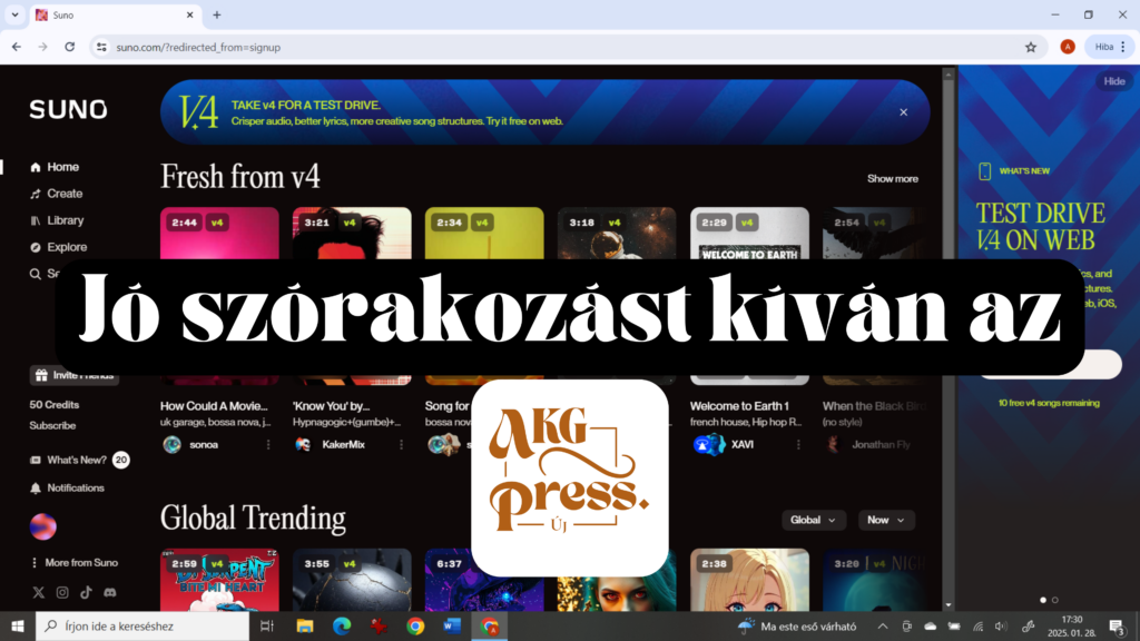 Az ingyenes verzióban 50 kredittel kell gazdálkodnod, ami naponta újratöltődik. Egy kattintásra két dal készül, ami 10 kreditet emészt fel.